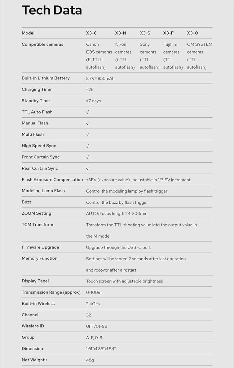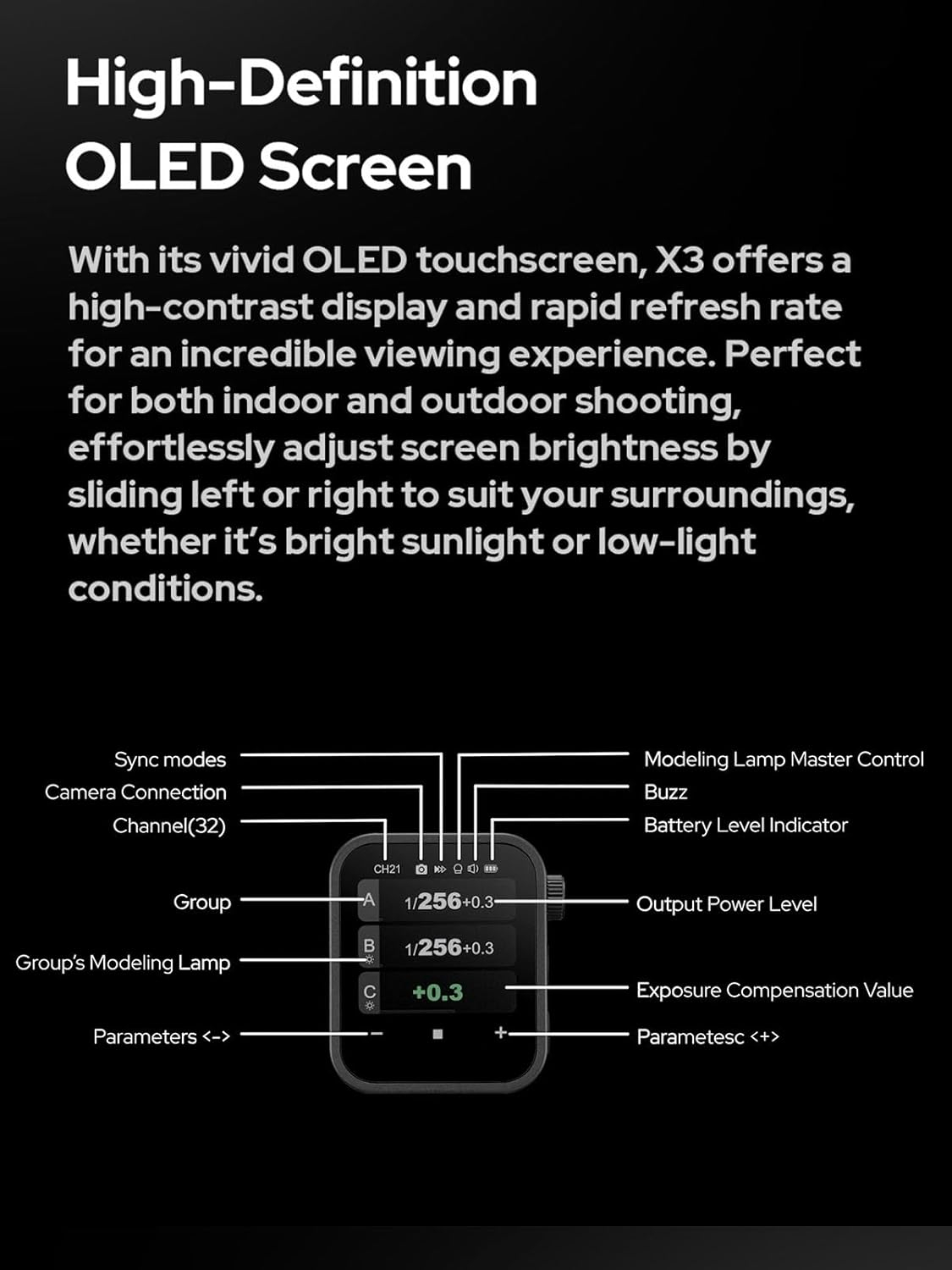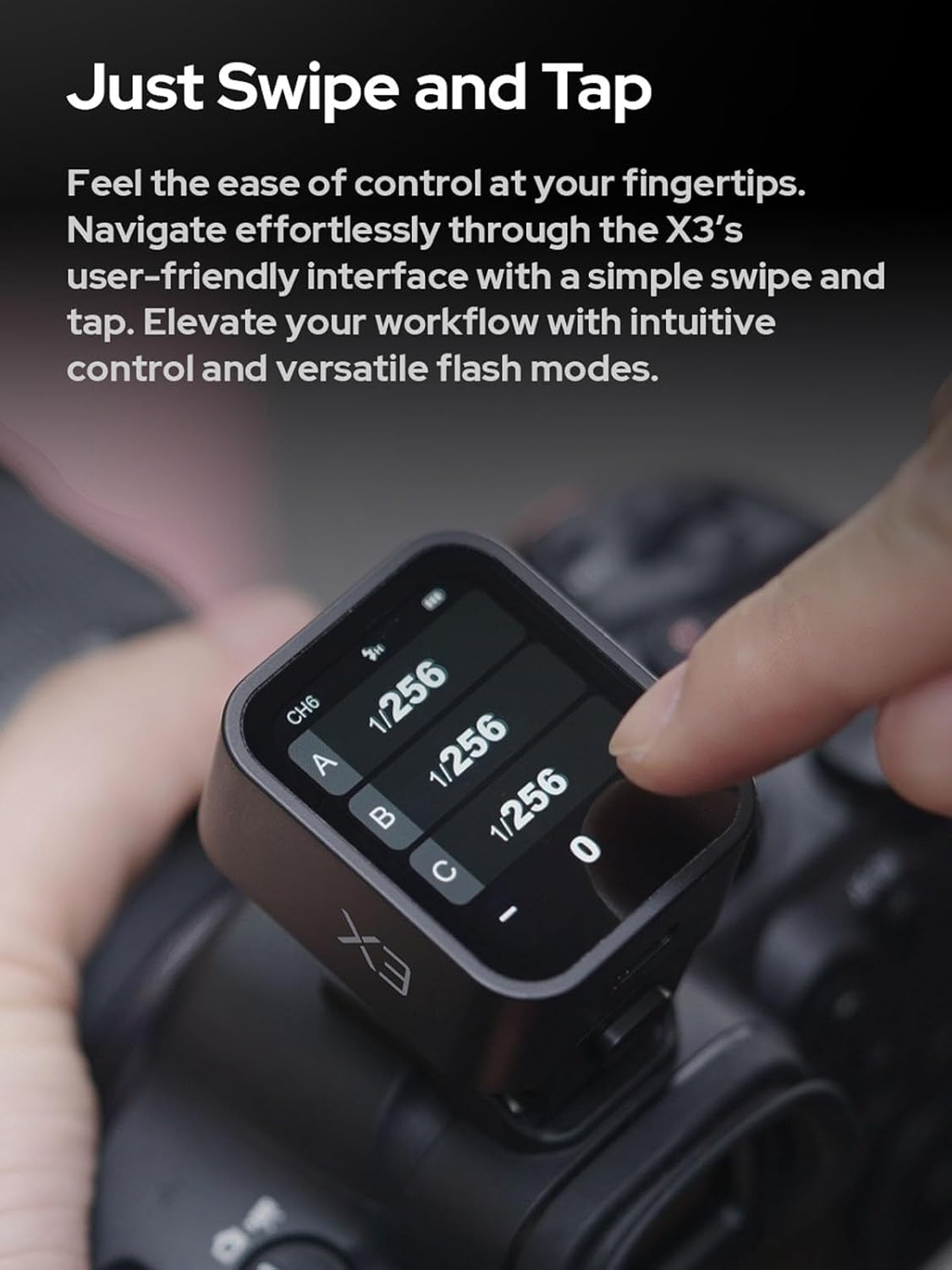 The Godox X3 is a game changer! If you like compact and slick this transmitter is for you. From battery life to versatility this gadget has you covered! Five days of continuous shooting! It looks good on the camera, touch screen panel. Loads of functionality to customize for your shooting style!!!